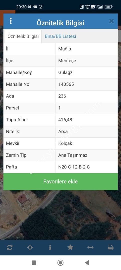 MUĞLA GÜLAĞZI MAHALLESİ KOLÇAK MEVKİİ SATILIK 416,48 M² İMARLI ARSA