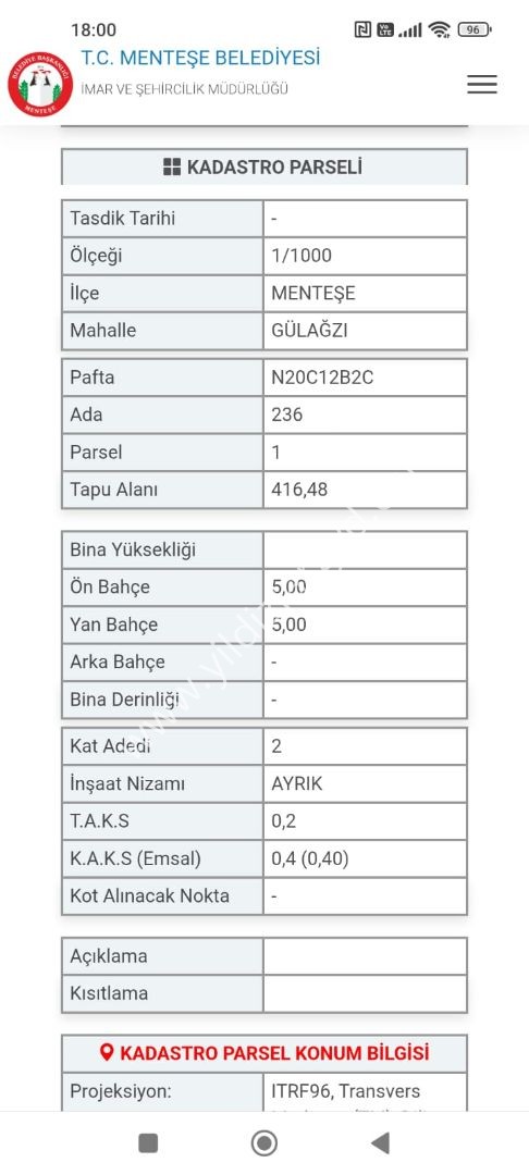 MUĞLA GÜLAĞZI MAHALLESİ KOLÇAK MEVKİİ SATILIK 416,48 m² İMARLI ARSA